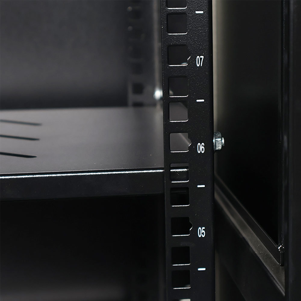 堅牢で互換性あり: 強化スチールフレームは、最大静的負荷100kgの標準19インチ機器をサポートします。